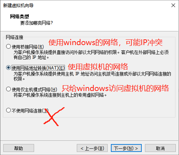 为虚拟机添加网络类型,建议使用网络地址转换,不建议不使用网络。