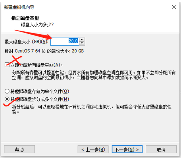 指定磁盘容量,建议在20G以上,将虚拟磁盘拆成多个文件,方便操作,不要勾选立即分配所有磁盘空间,会立刻占用硬盘空间。