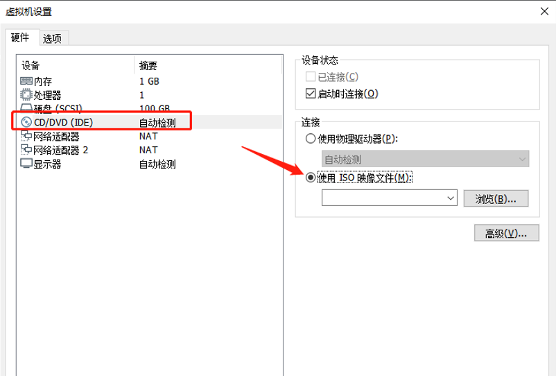 选择CD/DVD,在右边选择使用IOS印象文件,将下载好的Linux 镜像iso 文件添加进去。