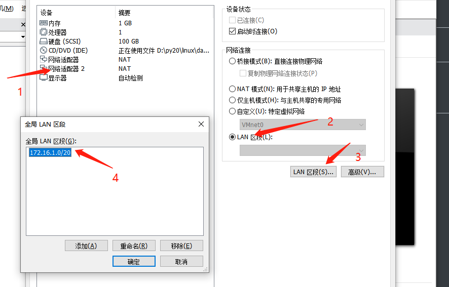 选择网络适配器2,将网络连接改为LAN区段,设置为下图中的全局LAN区段。
