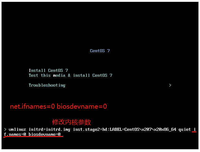 开启虚拟机进入安装界面,选择Install,CentOS 7,按tab键修改内核参数为 net.ifnames=0 biosdevname=0。