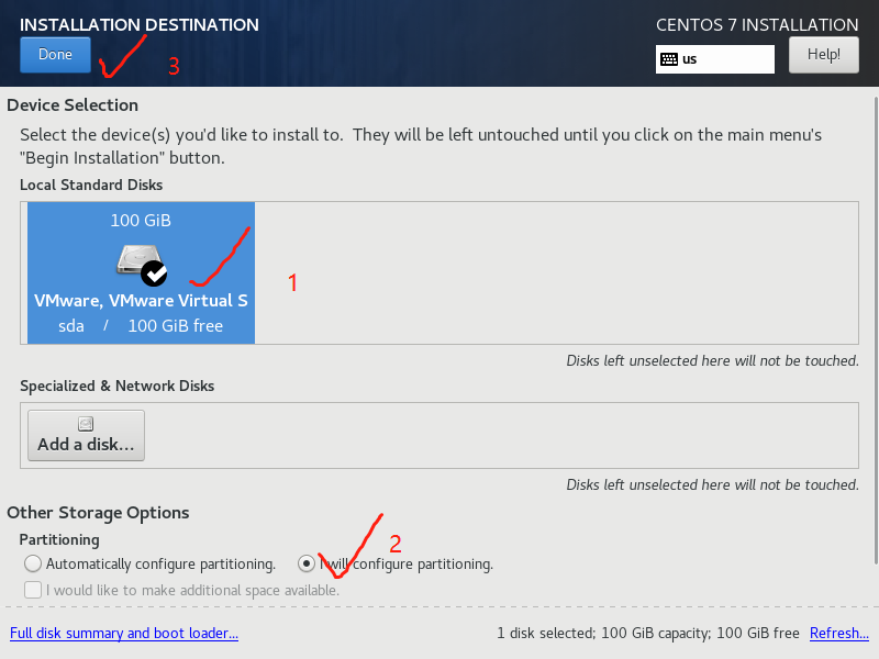 选择INSTALLATION DESTINATION设置硬盘分区。