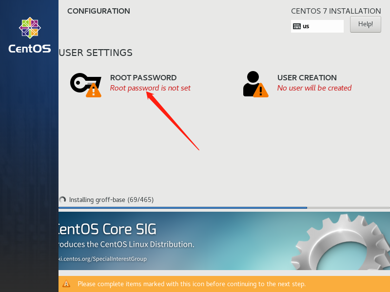 在安装过程中可以点击ROOR PASSWORD设置用户密码。