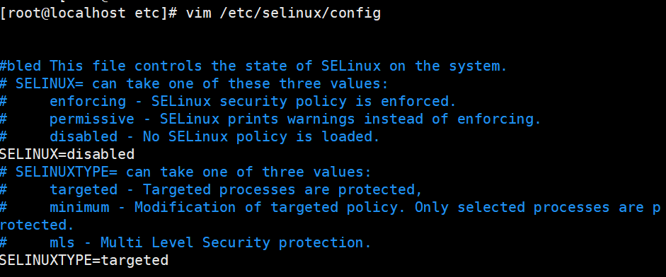 修改 /etc/selinux/config 中的SELINUX,改为disabled。