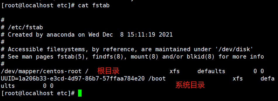 文件目录为/etc/fstab,作用为实现指定设备文件信息,进行开机自动挂载。