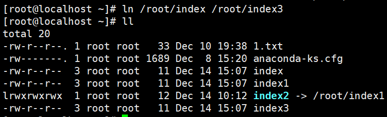 创建硬链接的命令 ln [原文件路径] [新文件路径]。