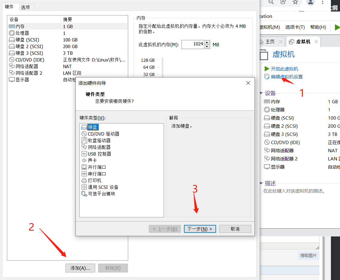 关闭虚拟机,选择编辑虚拟机设置,点击添加,选择硬盘,设置硬盘属性添加完成。