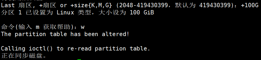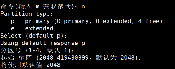 使用n命令新建分区,默认分区类型,默认分区号,默认起始扇区。