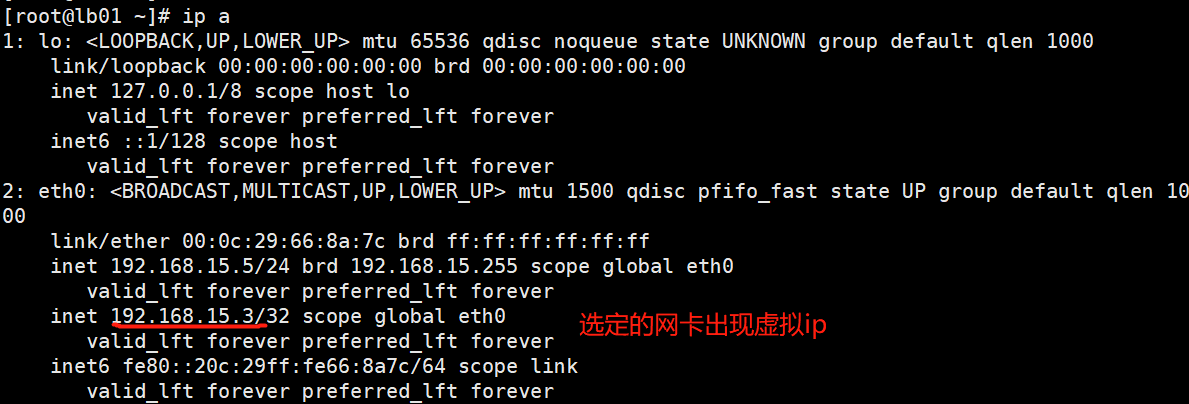 [root@lb02 ~]# cat /etc/keepalived/keepalived.conf ! Configuration File for keepalived global_defs { # 主机名 router_id lb02 } # 检测脚本 vrrp_script check_nginx { # 指定脚本路径 script "/etc/keepalived/checkNG.sh" # 执行间隔 interval 5 } # 配置VRRP协议 vrrp_instance VI_1 { #状态,MASTER和BACKUP #非抢占式需要使用BACKUP state BACKUP # 开启非抢占式 nopreempt #绑定网卡 interface eth0 #虚拟路由标示,可以理解为分组 virtual_router_id 50 #优先级 priority 90 #监测心跳间隔时间 advert_int 1 #配置认证 authentication { #认证类型 auth_type PASS #认证的密码 auth_pass 1111 } #设置VIP virtual_ipaddress { #虚拟的VIP地址 192.168.15.3 } # 调用检查 track_script { check_nginx } }