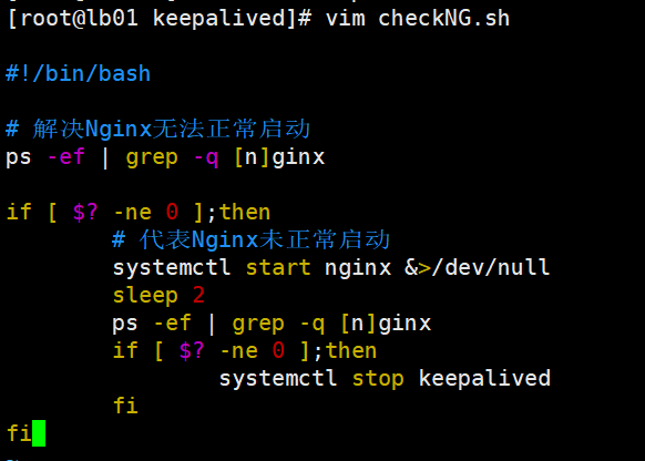 #!/bin/bash # 解决Nginx无法正常启动 ps -ef | grep -q [n]ginx if [ $? -ne 0 ];then # 代表Nginx未正常启动 systemctl start nginx &>/dev/null sleep 2 ps -ef | grep -q [n]ginx if [ $? -ne 0 ];then systemctl stop keepalived fi fi # $?表示上条命令的执行结果,0表示有结果 # -ne 表示不相等 # & 表示上条命令的输出 # >/dev/null 相当于放入回收站