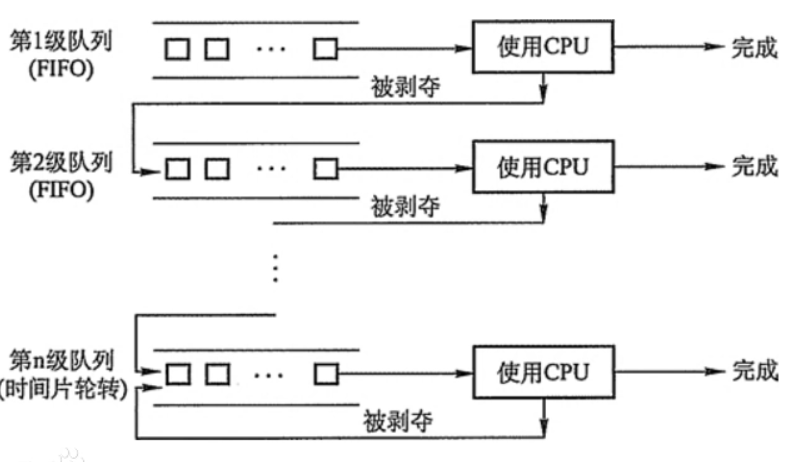 - 当一个新进程进入内存后,首先将它放入第一队列的末尾,按FCFS原则排队等待调度。当轮到该进程执行时,如它能在该时间片内完成,便可准备撤离系统;如果它在一个时间片结束时尚未完成,调度程序便将该进程转入第二队列的末尾,再同样地按FCFS原则等待调度执行;如果它在第二队列中运行一个时间片后仍未完成,再依次将它放入第三队列,……,如此下去,当一个长作业(进程)从第一队列依次降到第n队列后,在第n 队列便采取按时间片轮转的方式运行。