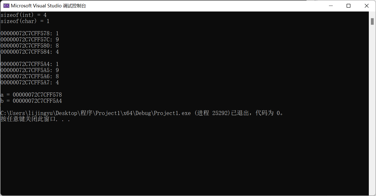 #include <stdio.h> #define N 4 int main() { int a[N] = {1, 9, 8, 4}; char b[N] = {'1', '9', '8', '4'}; int i; printf("sizeof(int) = %d\n", sizeof(int)); printf("sizeof(char) = %d\n", sizeof(char)); printf("\n"); // 输出数组a中每个元素的地址、值 for (i = 0; i < N; ++i) printf("%p: %d\n", &a[i], a[i]); printf("\n"); // 输出数组b中每个元素的地址、值 for (i = 0; i < N; ++i) printf("%p: %c\n", &b[i], b[i]); printf("\n"); // 输出数组名a和b对应的值 printf("a = %p\n", a); printf("b = %p\n", b); return 0; }
