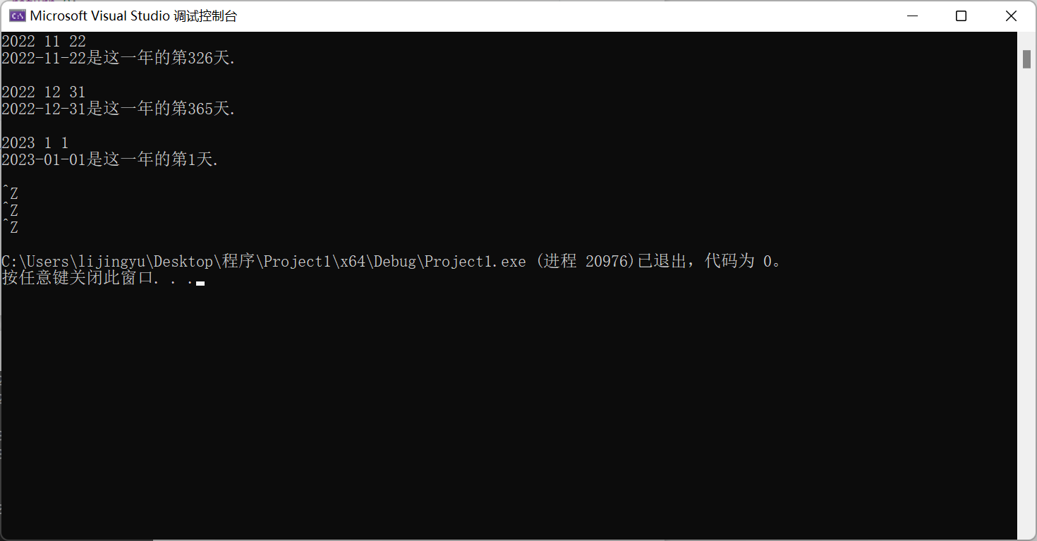 #include <stdio.h> #define N 13 int days_of_year(int year, int month, int day); int main() { int year, month, day; int days; while (scanf_s("%d%d%d", &year, &month, &day) != EOF) { days = days_of_year(year, month, day); printf("%4d-%02d-%02d是这一年的第%d天.\n\n", year, month, day, days); } return 0; } int days_of_year(int year, int month, int day) { int a[13] = { 0,31,28,31,30,31,30,31,31,30,31,30,31 }; int i, days = 0; for (i = 1; i < month; i++) days = days + a[i]; days = days + day; if (year % 4 == 0 && year % 100 != 0 || year % 400 == 0 && month > 2) days = days + 1; return days; }