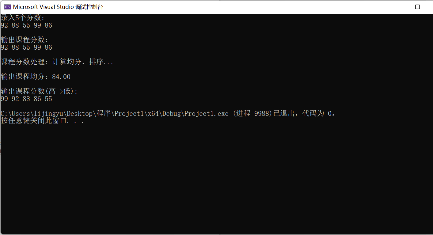 #include <stdio.h> #define N 5 // 函数声明 void input(int x[], int n); void output(int x[], int n); double average(int x[], int n); void bubble_sort(int x[], int n); int main() { int scores[N]; double ave; printf("录入%d个分数:\n", N); input(scores, N); printf("\n输出课程分数: \n"); output(scores, N); printf("\n课程分数处理: 计算均分、排序...\n"); ave = average(scores, N); bubble_sort(scores, N); printf("\n输出课程均分: %.2f\n", ave); printf("\n输出课程分数(高->低):\n"); output(scores, N); return 0; } // 函数定义 // 输入n个整数保存到整型数组x中 void input(int x[], int n) { int i; for (i = 0; i < n; ++i) scanf_s("%d", &x[i]); } // 输出整型数组x中n个元素 void output(int x[], int n) { int i; for (i = 0; i < n; ++i) printf("%d ", x[i]); printf("\n"); } double average(int x[], int n) { int i, s=0; double ave; for (i = 0; i < n; i++) s = s + x[i]; ave = s / n; return ave; } void bubble_sort(int x[], int n) { int i, j, k, m; for (i = 0; i < 5; i++) { m = x[i]; k = i; for (j = i; j < 5; j++) { if (x[j] > m) { m = x[j]; k = j; } } x[k] = x[i]; x[i] = m; } }
