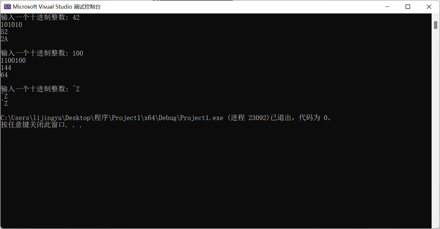 #include <stdio.h> #define N 100 void dec2n(int x, int n); // 函数声明 int main() { int x; printf("输入一个十进制整数: "); while (scanf_s("%d", &x) != EOF) { dec2n(x, 2); // 函数调用: 把x转换成二进制输出 dec2n(x, 8); // 函数调用: 把x转换成八进制输出 dec2n(x, 16); // 函数调用: 把x转换成十六进制输出 printf("\n输入一个十进制整数: "); } return 0; } void dec2n(int x, int n) { int i; int s[N]; while (n == 2) { for(i = 0; ; i++) { s[i] = x % 2; x = x / 2; if (x <= 0)break; } int j ; for (j = i; j >= 0; j--) { printf("%d", s[j]); } printf("\n"); break; } while (n == 8) { for (i = 0; ; i++) { s[i] = x % 8; x = x / 8; if (x <= 0)break; } int j; for (j = i; j >= 0; j--) { printf("%d", s[j]); } printf("\n"); break; } while (n == 16) { char t[N]={0}; for (i = 0; ; i++) { if (x % 16 == 10)t[i] = 'A'; else if (x % 16 == 11)t[i] = 'B'; else if (x % 16 == 12)t[i] = 'C'; else if (x % 16 == 13)t[i] = 'D'; else if (x % 16 == 14)t[i] = 'E'; else if (x % 16 == 15)t[i] = 'F'; else t[i] =(x % 16)+'0'; x = x / 16; if (x <= 0)break; } int j; for (j = i; j >= 0; j--) { printf("%c", t[j]); } printf("\n"); break; } }