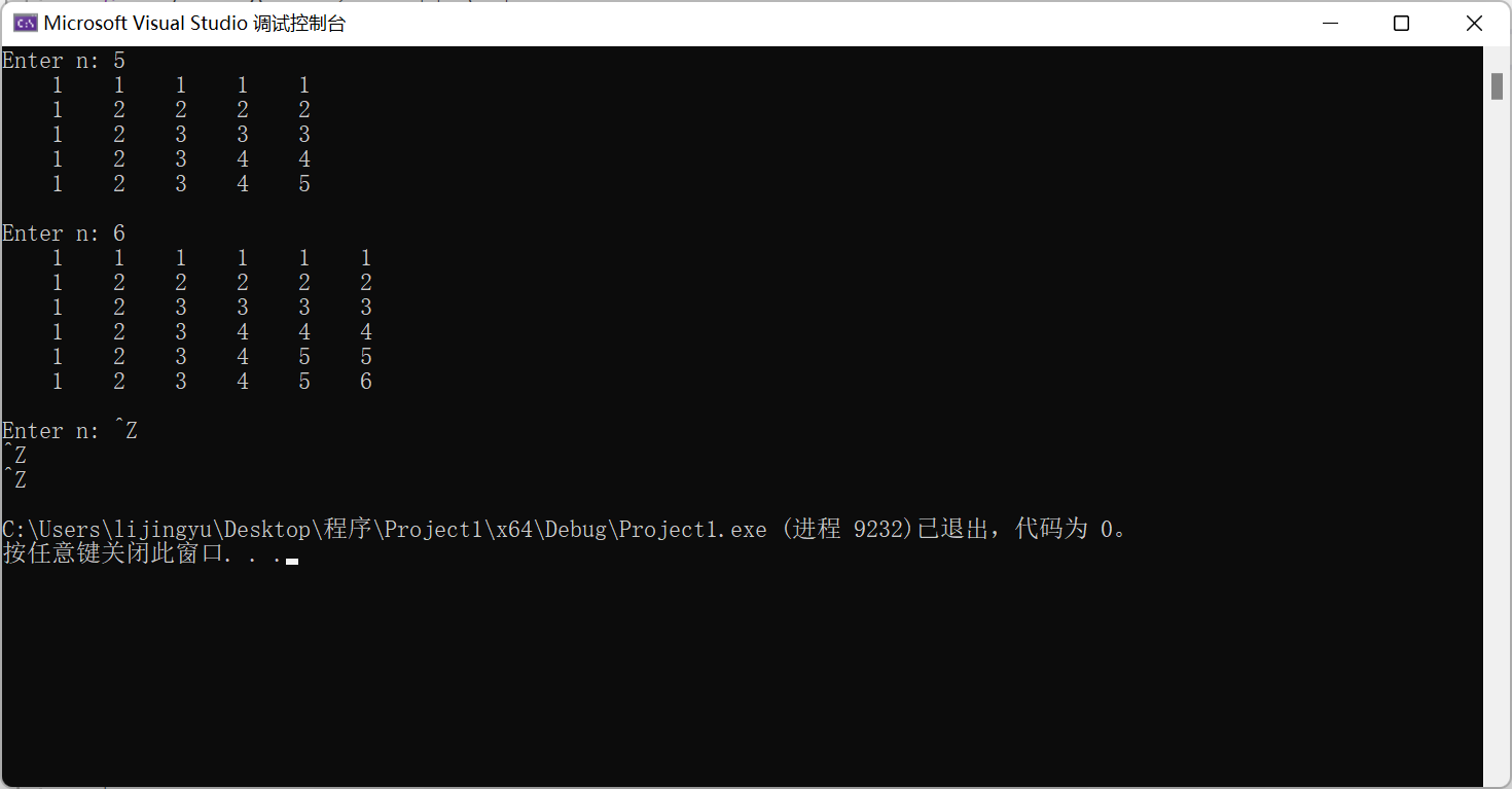 #include <stdio.h> #define N 100 // 函数声明 void func(int x[][N], int n); // 注意:两维数组作为形参的语法 void output(int x[][N], int n); // 注意:两维数组作为形参的语法 int main() { int x[N][N]; int i, j, n; printf("Enter n: "); while (scanf_s("%d", &n) != EOF) { func(x, n); // 注意:两维数组作为实参的语法 output(x, n); // 注意:两维数组作为实参的语法 printf("\nEnter n: "); } return 0; } void output(int x[][N], int n) { int i, j; for (i = 0; i < n; ++i) { for (j = 0; j < n; ++j) printf("%5d", x[i][j]); printf("\n"); } } void func(int x[][N], int n) { int i,j; for (i = 0; i < n; i++) { for (j = i; j < n; j++) x[i][j] = i + 1; } for (j = 0; j < n; j++) { for (i = j; i < n; i++) x[i][j] = j + 1; } }
