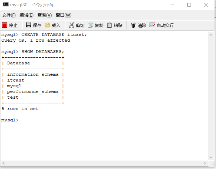 执行结果提示信息中,“5 rows in set ”表示集合有5行,说明数据库系统中有6个数据库,除itcast为用户创建的数据库外,其他数据库都是MySOL安装完成后自动创建的系统数据库。