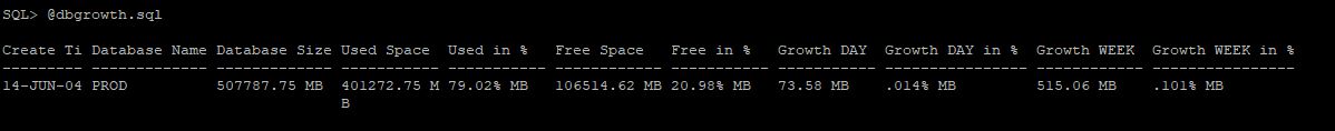 ROUND(((SUM(USED.BYTES) / 1024 / 1024 ) - (FREE.P / 1024 / 1024 ))/(select sysdate-min(creation_time) from v$datafile),2) || ' MB' "Growth DAY",