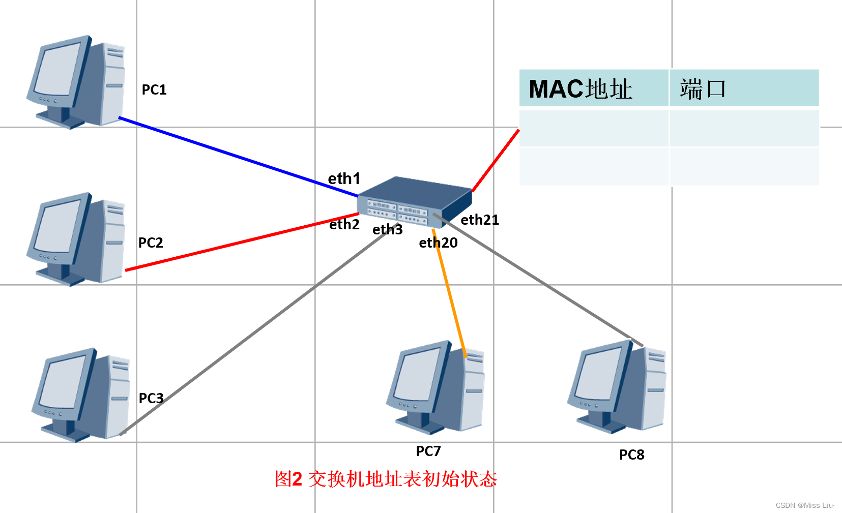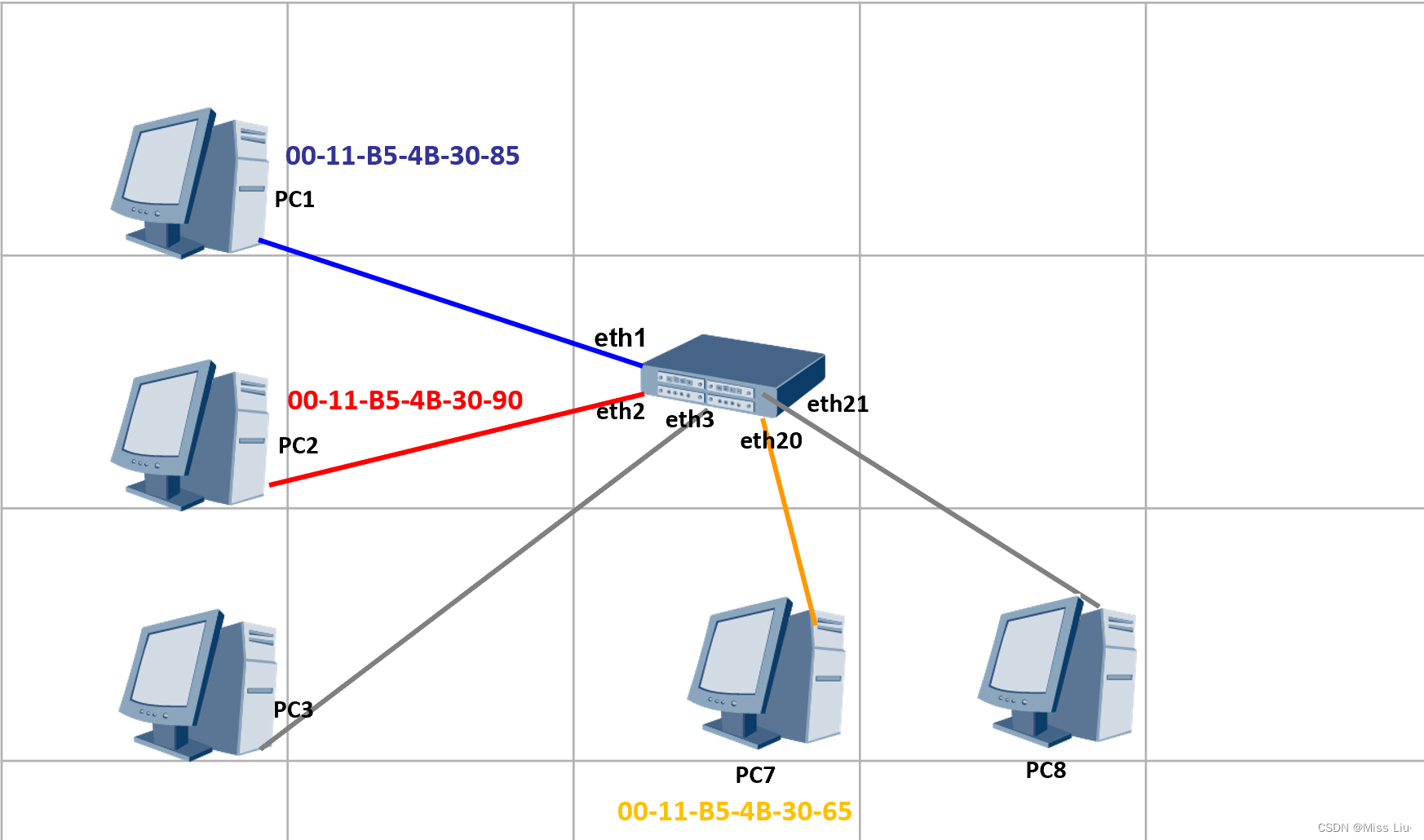 假设主机PC1向主机PC8发送一个数据帧,该数据帧被送到交换机后,交换机首先查MAC地址表,发现主机PC8连接在eth21接口上,就将数据帧从eth21接口转发出去。
