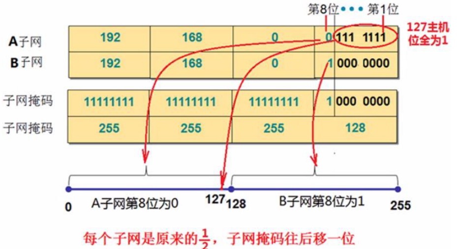 | 如果将该网段划分为等长的两端,子网掩码(二进制形式)向后移一位,也就是说网络部分多一位,主机部分少一位,即255.255.255.0(11111111.11111111.11111111.00000000)变成255.255.255.128(11111111.11111111.11111111.10000000)。 | |||