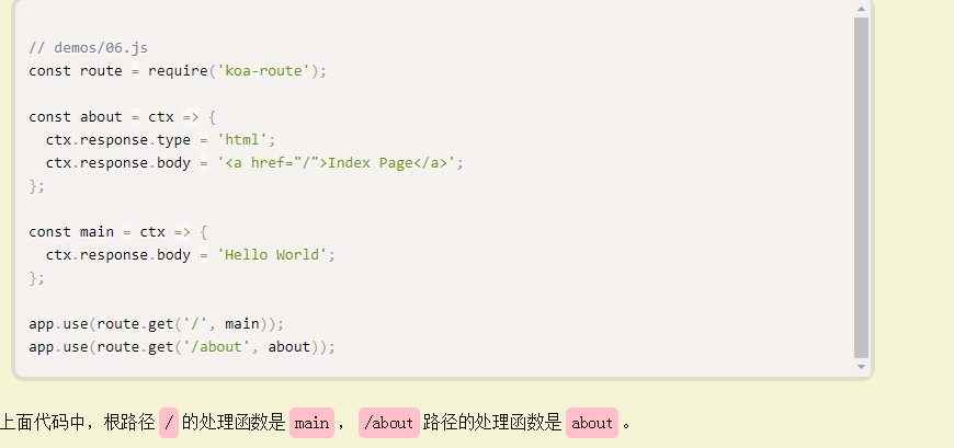 koa-route模块所建立的路由,支持类似与/:category/:id这样的参数路由,以及^/.*/?$正则匹配,可以通过this.params获取这些参数。