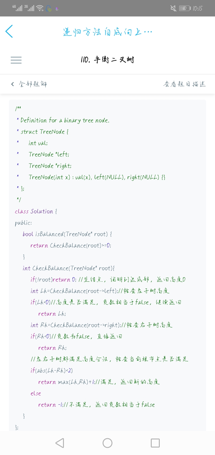 这道题目是平衡二叉树的代码,这个代码是通过判断他是否是高度平衡的二叉树,它们的高度是否超过了1,此代码运用了c++语言,int整形结构,先定义一个二叉树节点,再用TreeNode定义一个树节点,当root为空时则说明达到了叶节点,用int Lh检查左子树的高度,再运用if-else型语句判断是否满足条件。这个c++语言还没有学,所以这个优点也不是特别的清楚,只知道这个c++语言不需要复杂的设计环境,但他的语言本身比较复杂,这个代码也运用到的我们这个课程的if-else型语句,能让我们更加的了解的这个语句的重要性,也能让我更加的了解和掌握这个语句。
