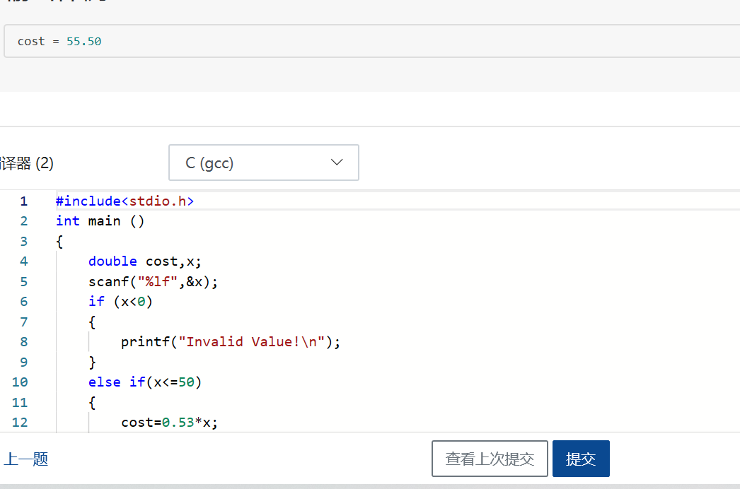 题目内容描述:为了提倡居民节约用电,某省电力公司执行“阶梯电价”,安装一户一表的居民用户电价分为两个“阶梯”:月用电量50千瓦时(含50千瓦时)以内的,电价为0.53元/千瓦时;超过50千瓦时的,超出部分的用电量,电价上调0.05元/千瓦时。请编写程序计算电费。