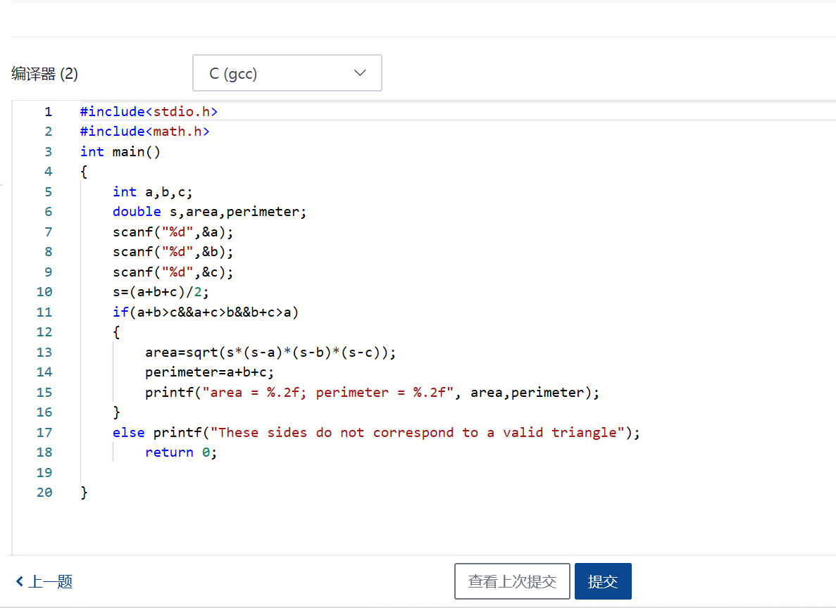 1.2题目二:本题要求编写程序,根据输入的三角形的三条边a、b、c,计算并输出面积和周长。注意:在一个三角形中, 任意两边之和大于第三边。三角形面积计算公式:area=√s(s−a)(s−b)(s−c),其中s=(a+b+c)/2。