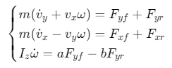 - 状态变量:侧向速度vy、纵向速度vx、横摆角速度ω