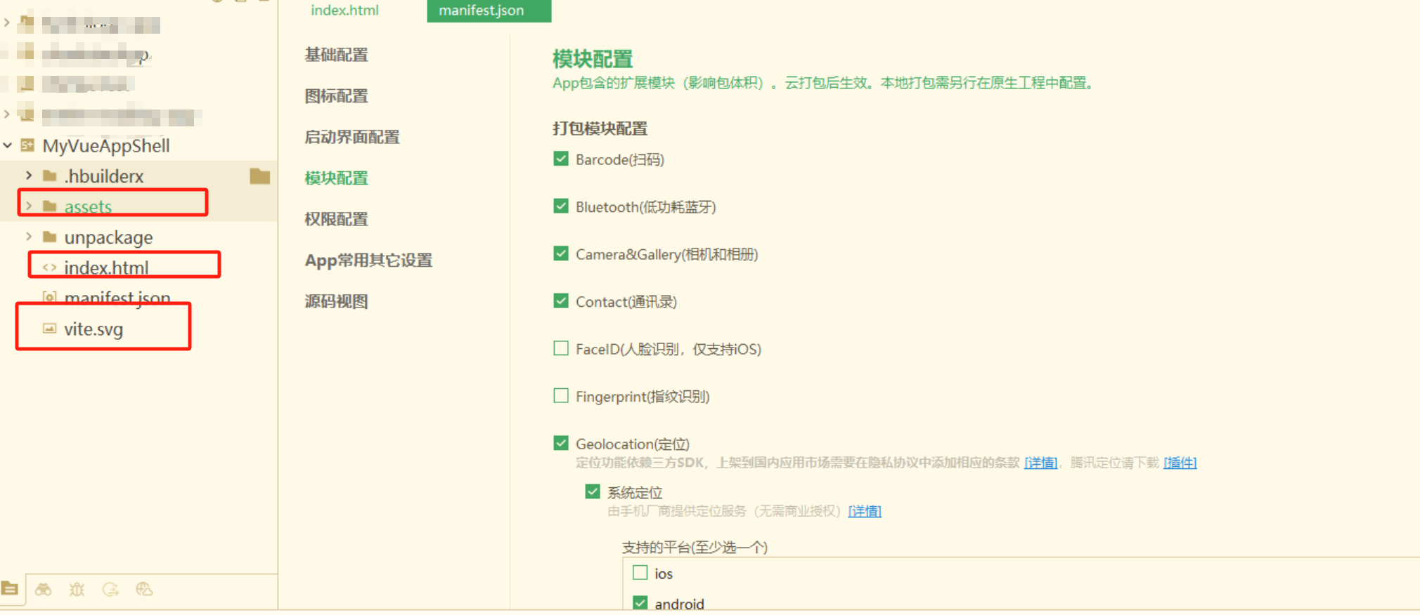 然后,删除所有的默认文件,只留下manifest.json文件,把你打包好的vue项目,dist下的内容全部复制到这个项目下,并且去manifest.json模块配置下对相对应功能进行勾选,如图,红框部分是正常vue项目打包后dist下的内容