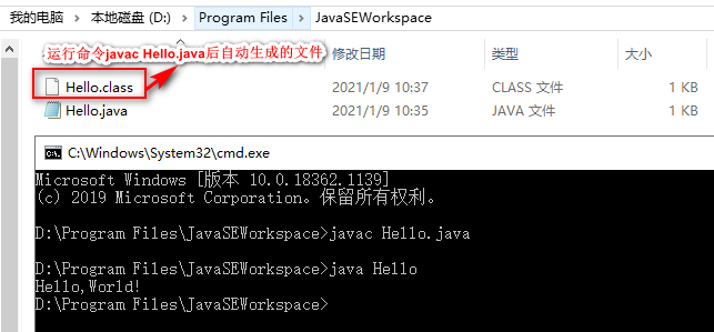 在命令行窗口编译.java文件,DOS命令:javac java文件,会生成一个.class文件