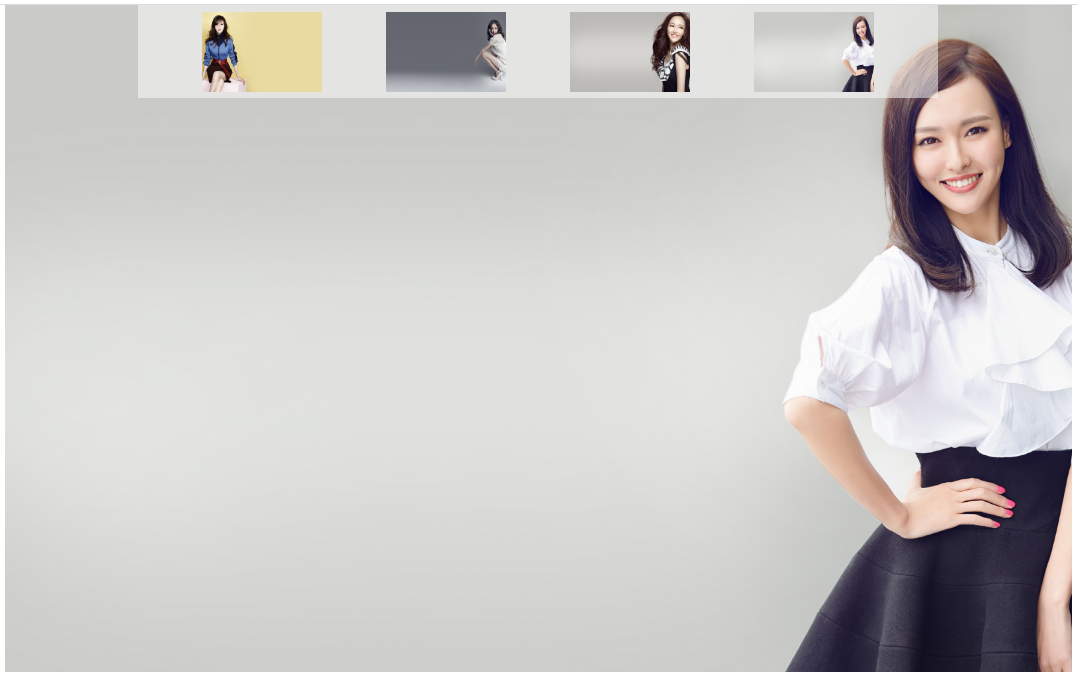 1 <head> 2 <meta charset="UTF-8"> 3 <title>Title</title> 4 <style type="text/css"> 5 *{ 6 margin: 0; 7 padding: 0; 8 } 9 ul li{ 10 list-style: none; 11 } 12 #skin{ 13 position: fixed; 14 top:0; 15 left:0; 16 width: 100%; 17 height: 100%; 18 background-image: url("images/skin1.jpg"); 19 background-position: center 0; 20 background-repeat: no-repeat; 21 } 22 #skin-photo{ 23 width: 100%; 24 height: 100px; 25 position: relative; 26 z-index: 10; 27 } 28 #skin-photo ul{ 29 overflow: hidden; 30 width: 1200px; 31 margin: 0 auto; 32 background-color: rgba(255,255,255,.5); 33 } 34 #skin-photo ul li{ 35 float: left; 36 height: 120px; 37 margin: 10px 0 10px 96px; 38 cursor: pointer; 39 } 40 #skin-photo ul li img{ 41 width: 180px; 42 height: 120px; 43 } 44 45 </style> 46 </head> 47 <body> 48 <div id="skin"></div> 49 <div id="skin-photo"> 50 <ul> 51 <li class="skin-photo"> 52 <img src="images/skin1.jpg"> 53 </li> 54 <li class="skin-photo"> 55 <img src="images/skin2.jpg"> 56 </li> 57 <li class="skin-photo"> 58 <img src="images/skin3.jpg"> 59 </li> 60 <li class="skin-photo"> 61 <img src="images/skin4.jpg"> 62 </li> 63 </ul> 64 </div> 65 <script type="text/javascript"> 66 var imgLi = document.getElementsByClassName('skin-photo'); 67 var skinDiv = document.getElementById('skin'); 68 for(var i=0; i<imgLi.length; i++){ 69 imgLi[i].index = i + 1; 70 imgLi[i].onclick = function () { 71 skinDiv.style.backgroundImage=`url("images/skin${this.index}.jpg")`; 72 } 73 } 74 </script>