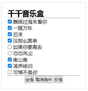 1 <head> 2 <meta charset="UTF-8"> 3 <title>Title</title> 4 <style type="text/css"> 5 *{ 6 margin: 0; 7 padding: 0; 8 } 9 li{ 10 list-style: none; 11 } 12 #box{ 13 width: 30%; 14 height: auto; 15 border: 1px solid #ddd; 16 padding: 20px; 17 margin: 100px auto; 18 border-radius: 4px; 19 } 20 #box ul li{ 21 } 22 #btn{ 23 text-align: center; 24 } 25 </style> 26 </head> 27 <body> 28 <div id="box"> 29 <h2>千千音乐盒</h2> 30 <hr> 31 <ul> 32 <li> 33 <input type="checkbox"> 34 <span>飘扬过海来看你</span> 35 </li> 36 <li> 37 <input type="checkbox"> 38 <span>一眼万年</span> 39 </li> 40 <li> 41 <input type="checkbox"> 42 <span>后来</span> 43 </li> 44 <li> 45 <input type="checkbox"> 46 <span>没那么简单</span> 47 </li> 48 <li> 49 <input type="checkbox"> 50 <span>如果你要离去</span> 51 </li> 52 <li> 53 <input type="checkbox"> 54 <span>恋恋风尘</span> 55 </li> 56 <li> 57 <input type="checkbox"> 58 <span>南山南</span> 59 </li> 60 <li> 61 <input type="checkbox"> 62 <span>涛声依旧</span> 63 </li> 64 <li> 65 <input type="checkbox"> 66 <span>可惜不是你</span> 67 </li> 68 </ul> 69 <hr> 70 <p id="btn"> 71 <button id="allSelect">全选</button> 72 <button id="cancelSelect">取消选中</button> 73 <button id="reverseSelect">反选</button> 74 </p> 75 <script type="text/javascript"> 76 //获取按钮元素 77 function $(id) { 78 return typeof id === 'string' ? document.getElementById(id) : null; 79 } 80 //获取左右的复选框 81 var inputs = document.getElementsByTagName('input'); 82 //全选 83 $('allSelect').onclick = function () { 84 for(var i=0; i<inputs.length; i++){ 85 inputs[i].checked = true; 86 } 87 } 88 //取消选中 89 $('cancelSelect').onclick = function () { 90 for(var i=0; i<inputs.length; i++){ 91 inputs[i].checked = false; 92 } 93 } 94 //反选 95 $('reverseSelect').onclick = function () { 96 for(var i=0; i<inputs.length; i++){ 97 inputs[i].checked = !inputs[i].checked; //注意反选这里用了!符号 98 } 99 } 100 </script> 101 </div> 102 </body>