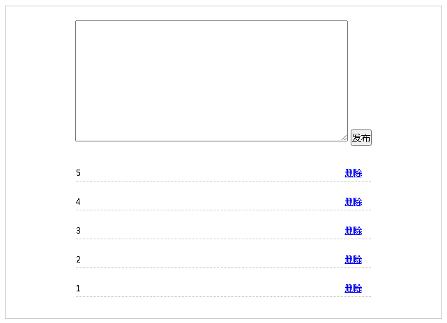 1 <head> 2 <meta charset="UTF-8"> 3 <title>Title</title> 4 <style type="text/css"> 5 *{ 6 margin: 0; 7 padding: 0; 8 } 9 li{ 10 list-style: none; 11 } 12 #box{ 13 width: 600px; 14 border: 1px solid #ccc; 15 margin: 120px auto; 16 text-align: center; 17 padding: 10px; 18 font-size: 12px; 19 } 20 #box-top{ 21 padding: 10px; 22 } 23 #comment-text{ 24 padding: 10px; 25 outline: none; 26 } 27 #box-comment ul{ 28 overflow: hidden; 29 } 30 #box-comment ul li{ 31 width: 420px; 32 margin: 20px auto; 33 height: 20px; 34 border-bottom: 1px dashed #ccc; 35 } 36 #box-comment ul li span{ 37 float: left; 38 width: 260px; 39 text-align: left; 40 } 41 #box-comment ul li a{ 42 width: 50px; 43 float: right; 44 } 45 46 </style> 47 </head> 48 <body> 49 <div id="box"> 50 <div id="box-top"> 51 <textarea cols="50" rows="10" id="comment-text"></textarea> 52 <button id="send">发布</button> 53 </div> 54 <div id="box-comment"> 55 <ul id="list-comment"> 56 </ul> 57 </div> 58 </div> 59 <script type="text/javascript"> 60 window.onload = function () { 61 function $(id) { 62 return typeof id === 'string' ? document.getElementById(id) : null; 63 } 64 65 //发布评论 66 $('send').onclick = function () { 67 var get_comment = $('comment-text').value; 68 if (get_comment.length === 0) { 69 alert('请输入内容'); 70 return; 71 } 72 var createLi = document.createElement('li'); 73 createLi.innerHTML = `<span>${get_comment}</span><a href = 'javascript:void(0)' class="del">删除</a>`; 74 // $('list-comment').appendChild(createLi); 75 $('list-comment').insertBefore(createLi, $('list-comment').children[0]); //插入到子元素的前面 76 $('comment-text').value = ''; 77 78 79 //删除评论 80 var delAs = document.getElementsByClassName('del'); 81 for (var i = 0; i < delAs.length; i++) { 82 delAs[i].onclick = function () { 83 this.parentNode.remove(); //删除 84 } 85 } 86 } 87 } 88 </script> 89 </body>