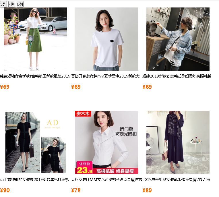 1 <head> 2 <meta charset="UTF-8"> 3 <title>Title</title> 4 <style type="text/css"> 5 *{ 6 padding: 0; 7 margin: 0; 8 } 9 #wrap{ 10 overflow: hidden; 11 } 12 #wrap .item{ 13 width: 248px; 14 height: 360px; 15 font-size: 13px; 16 17 } 18 #wrap .item .title{ 19 width: 248px; 20 height: 30px; 21 line-height: 30px; 22 overflow: hidden; 23 margin-bottom: 10px; 24 } 25 .imgContainer{ 26 width: 248px; 27 display: table-cell; 28 text-align: center; 29 } 30 #wrap .item .price{ 31 color:#ff6700; 32 font-size: 18px; 33 font-weight: bold; 34 } 35 </style> 36 <script type="text/javascript"> 37 window.onload = function () { 38 function setcol(num) { 39 var wrapDiv = document.getElementById('wrap'); 40 var itemDivs = document.getElementsByClassName('item'); 41 wrapDiv.style.width = (num * itemDivs[0].offsetWidth) + 'px'; //根据列数得出容器的宽度 42 for(var j=0; j<itemDivs.length; j++){ 43 itemDivs[j].style.float = 'left'; 44 } 45 } 46 var btns = document.getElementsByTagName('button'); 47 btns[0].onclick = function () { 48 setcol(3); 49 } 50 btns[1].onclick = function () { 51 setcol(4); 52 } 53 btns[2].onclick = function () { 54 setcol(5); 55 } 56 } 57 </script> 58 </head> 59 <body> 60 <div class="cols"> 61 <button>3列</button> 62 <button>4列</button> 63 <button>5列</button> 64 </div> 65 <div id="wrap"> 66 <div class="item"> 67 <div class="imgContainer"> 68 <img src="images/taobao_1.jpg" alt=""> 69 </div> 70 <p class="title">纯色短袖女春季秋t恤韩版国新款服装2019潮</p> 71 <p class="price">¥69</p> 72 </div> 73 <div class="item"> 74 <div class="imgContainer"> 75 <img src="images/taobao_2.jpg" alt=""> 76 </div> 77 <p class="title">百搭开春装女胖mm夏季显瘦2019新款大码韩版</p> 78 <p class="price">¥69</p> 79 </div> 80 <div class="item"> 81 <div class="imgContainer"> 82 <img src="images/taobao_3.jpg" alt=""> 83 </div> 84 <p class="title">婚纱2019新款欧美韩式孕妇婚纱高腰韩版</p> 85 <p class="price">¥69</p> 86 </div> 87 <div class="item"> 88 <div class="imgContainer"> 89 <img src="images/taobao_4.jpg" alt=""> 90 </div> 91 <p class="title">点上衣很仙的女装夏2019新款洋气打底衫</p> 92 <p class="price">¥90</p> 93 </div> 94 <div class="item"> 95 <div class="imgContainer"> 96 <img src="images/taobao_5.jpg" alt=""> 97 </div> 98 <p class="title">大码女装胖MM文艺时尚格子圆点显瘦连衣裙</p> 99 <p class="price">¥78</p> 100 </div> 101 <div class="item"> 102 <div class="imgContainer"> 103 <img src="images/taobao_6.jpg" alt=""> 104 </div> 105 <p class="title">2019夏季新款女装韩版修身显瘦V领无袖</p> 106 <p class="price">¥89</p> 107 </div> 108 <div class="item"> 109 <div class="imgContainer"> 110 <img src="images/taobao_7.jpg" alt=""> 111 </div> 112 <p class="title">春季短款小外套女2019春装春秋新款韩</p> 113 <p class="price">¥100</p> 114 </div> 115 <div class="item"> 116 <div class="imgContainer"> 117 <img src="images/taobao_8.jpg" alt=""> 118 </div> 119 <p class="title">大码女装中长款针织衫春装胖mm显瘦</p> 120 <p class="price">¥120</p> 121 </div> 122 <div class="item"> 123 <div class="imgContainer"> 124 <img src="images/taobao_9.jpg" alt=""> 125 </div> 126 <p class="title">春款韩版2019新款女装时尚初春两件套</p> 127 <p class="price">¥107</p> 128 </div> 129 <div class="item"> 130 <div class="imgContainer"> 131 <img src="images/taobao_10.jpg" alt=""> 132 </div> 133 <p class="title">牛仔外套女短款2019春装新款女装韩版</p> 134 <p class="price">¥69</p> 135 </div> 136 <div class="item"> 137 <div class="imgContainer"> 138 <img src="images/taobao_11.jpg" alt=""> 139 </div> 140 <p class="title">2019夏季新款女装裙子纯色流苏a字裙</p> 141 <p class="price">¥56</p> 142 </div> 143 <div class="item"> 144 <div class="imgContainer"> 145 <img src="images/taobao_12.jpg" alt=""> 146 </div> 147 <p class="title">女装休闲短袖韩版宽松2019新款春夏季</p> 148 <p class="price">¥76</p> 149 </div> 150 <div class="item"> 151 <div class="imgContainer"> 152 <img src="images/taobao_13.jpg" alt=""> 153 </div> 154 <p class="title">棉上衣女装秋季新款2019早春休闲时尚</p> 155 <p class="price">¥45</p> 156 </div> 157 </div> 158 159 </body>