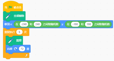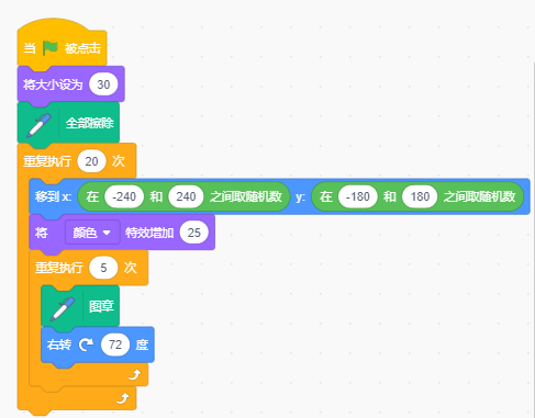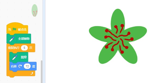 2.将图章和右旋转15度拖动到代码编辑区,并嵌入在重复执行10次中,修改为重复执行5次,右旋72度,画出了一朵花.