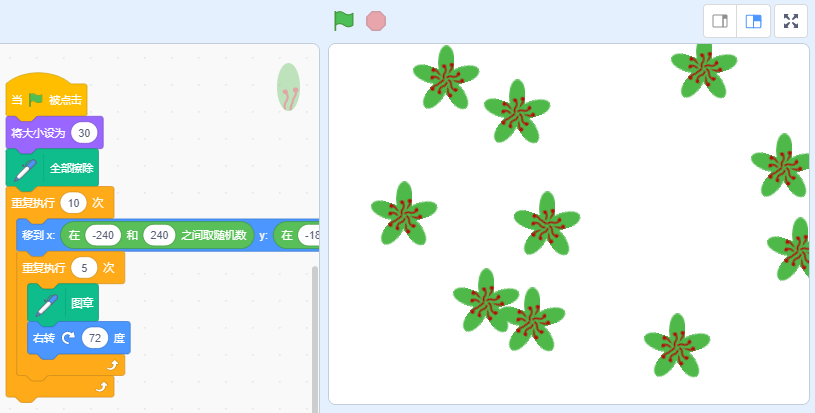 5.思考:如何修改脚本,使之当单击小绿旗后,花朵就会连续在舞台不同位置出现?比如说,现在想在花园里开10朵花,怎么办?