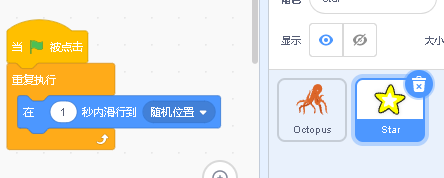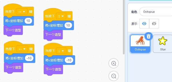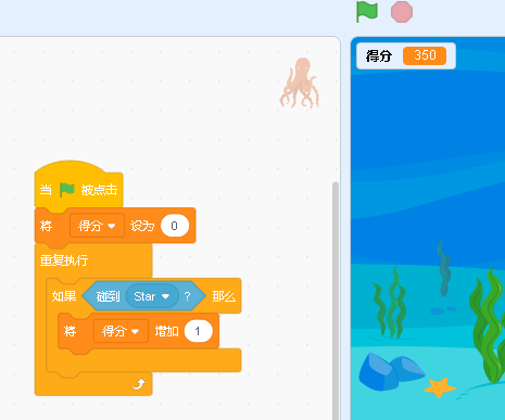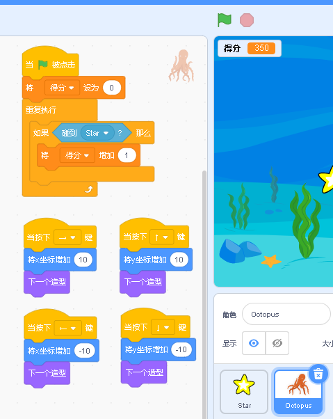 星星在海底随机运动,键盘上下左右控制章鱼,追逐星星,如果追上,就加分.