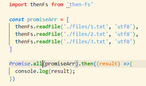 调用 then-fs 提供的 readFile() 方法,可以异步地读取文件的内容,它的返回值是 Promise 的实例对象。因此可以调用 .then() 方法为每个 Promise 异步操作指定成功和失败之后的回调函数。示例代码如下: