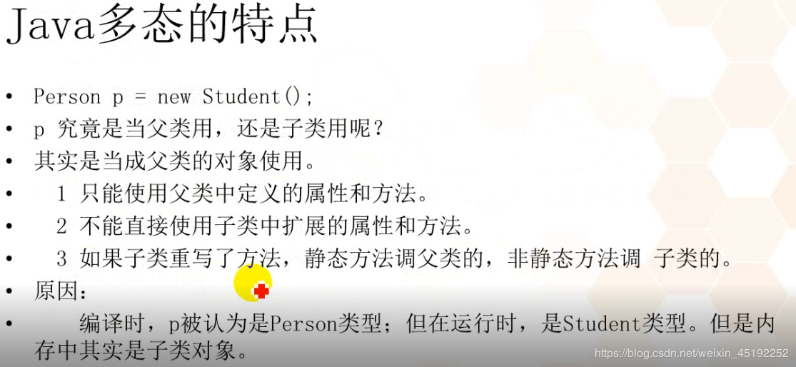 什么是多态:一个对象具备多种形态,也可以理解为事物存在的多种体现形态(父类的引用类型变量指向了子类对象,或者是接口的引用类型变量指向了接口实现类的对象)