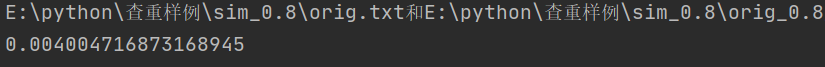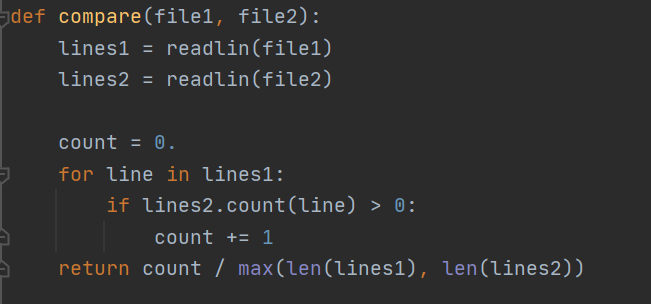 所以我设 lines1 和 lines2 分别为两个输入文件中的所有文本行。先对文件1中的所有行进行遍历,如果文件2中包括文件1的行line,count加1,结果为相同的行的个数与两个文件最大行的比值,当2个文件长度相同,且每一行都相同时,取最大值,这是比较简便的求法。