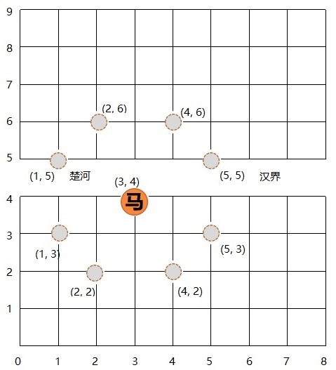 其中“马”以日字形规则移动,如马当前的坐标位置是(3, 4),它的下一步可以到达(2, 6), (4, 6), (5, 5), (5, 3), (4, 2), (2, 2), (1, 3), (1, 5)共八个位置(如图所示)。