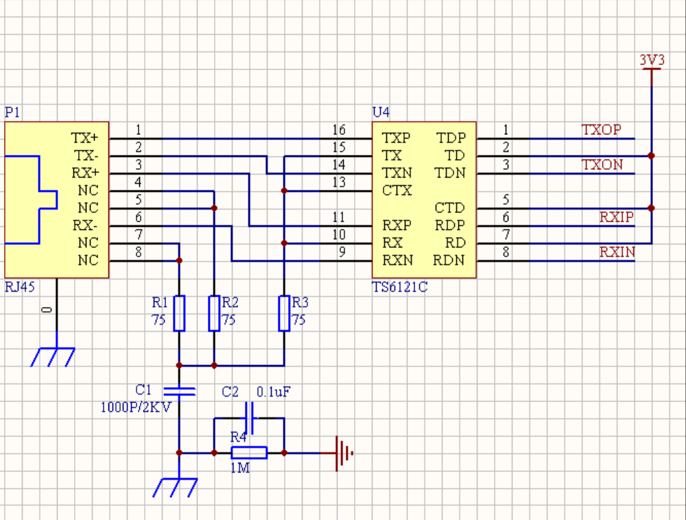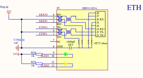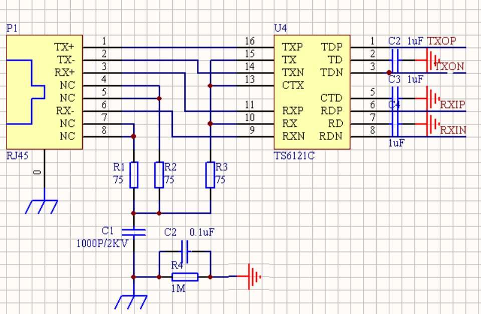 通过一个网络变压器+Bob Smith匹配,其作用网络变压器主要有信号传输、阻抗匹配、网络变压器主要有信号传输、阻抗匹配、波形修复、信号杂波抑制和高电压隔离等作用。而BobSmith电路的作用是为了改善端口EMC的差模,共模阻抗匹配的端接处理方式。这种电路能有效的滤除共模干扰,该电路可以降低10dB左右的EMI衰减。