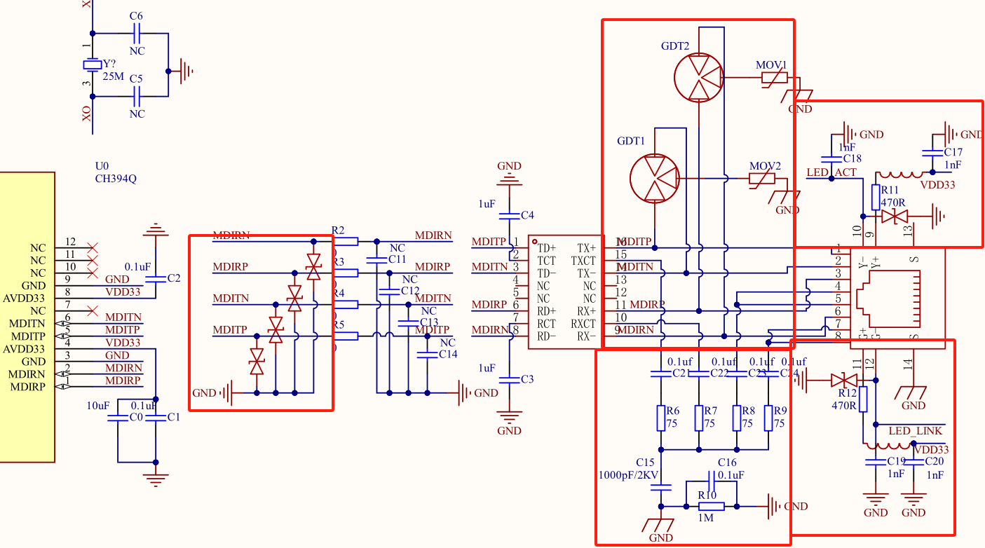 1)、对于独立网络变压器的结构需要在网络变压器与RJ45之间的差分对加对地的ESD管,LED控制管脚也要加对地的ESD管以防止PHY的信号脚于LED控制脚被ESD打坏。