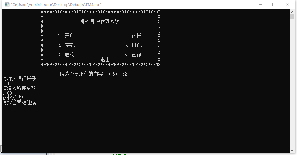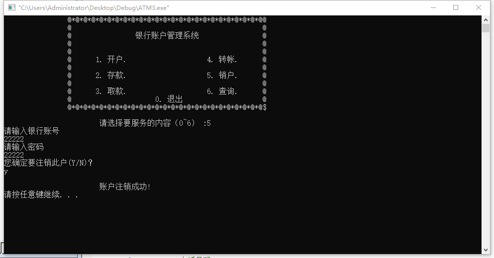 <<"\t\t@ 2. 存款. 5. 销户. @" <<endl