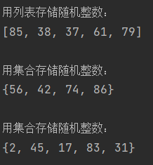 1 import random 2 3 print('用列表存储随机整数:') 4 lst = [random.randint(0, 100) for i in range(5)] 5 print(lst) 6 7 print('\n用集合存储随机整数:') 8 s1 = {random.randint(0, 100) for j in range(5)} 9 print(s1) 10 11 print('\n用集合存储随机整数:') 12 s2 = set() 13 while len(s2) < 5: 14 s2.add(random.randint(0,100)) 15 print(s2)