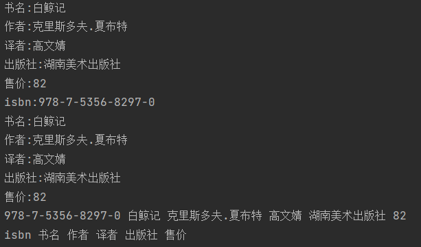 1 #字典遍历 2 book_info = {'isbn': '978-7-5356-8297-0', 3 '书名': '白鲸记', 4 '作者': '克里斯多夫.夏布特', 5 '译者': '高文婧', 6 '出版社': '湖南美术出版社', 7 '售价':'82'} 8 9 #1.key,value 10 for key, value in book_info.items(): 11 print(f'{key}:{value}') 12 13 #2.item 14 for item in book_info.items(): 15 print(f'{item[0]}:{item[1]}') 16 17 #3.值value 18 for value in book_info.values(): 19 print(value, end=' ') 20 print() 21 22 #值key 23 for key in book_info.keys(): 24 print(key,end=' ')