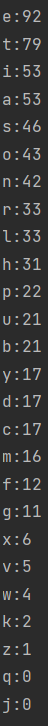 23 x = x.lower() 24 t = [] 25 for i in range(97, 97+26): 26 c = x.count(chr(i)) 27 t.append([c, chr(i)]) 28 t = sorted(t, reverse=True) 29 for j in t: 30 print(f'{j[1]}:{j[0]}')