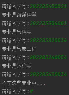 1 d = {8326: '地信类', 2 8329: '计算机类', 3 8330: '气科类', 4 8336: '防灾工程', 5 8345: '海洋科学', 6 8382: '气象工程'} 7 print('{:-^50}'.format('专业代号信息')) 8 for i in d.items(): 9 print(f'{i[0]}: {i[1]}') 10 11 print('{:-^50}'.format('学生专业查询')) 12 while True: 13 x = input('请输入学号:') 14 if x == '#': 15 print('查询结束') 16 break 17 t = int(x[4:8]) 18 if t in d: 19 print(f'专业是{d[t]}') 20 elif t not in d: 21 print('不在这些专业中...')
