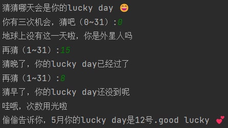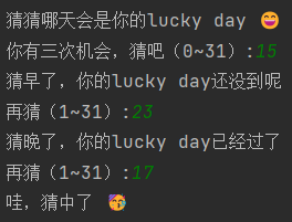 1 import random 2 lucky_day = random.randint(1, 31) 3 print('猜猜哪天会是你的lucky day', chr(0x1f604)) 4 5 i = 1 6 x = list(range(1,32)) 7 d = {1: '你有三次机会,猜吧(0~31):', 2: '再猜(1~31):', 3: '再猜(1~31):'} 8 while i <= 4: 9 if i == 4: 10 print(f'哇哦,次数用光啦\n偷偷告诉你,5月你的lucky day是{lucky_day}号.good lucky', chr(0x1f495)) 11 break 12 day = int(input(d[i])) 13 if day in x: 14 if day == lucky_day: 15 print('哇,猜中了', chr(0x1f973)) 16 break 17 elif day > lucky_day: 18 print('猜晚了,你的lucky day已经过了') 19 elif day < lucky_day: 20 print('猜早了,你的lucky day还没到呢') 21 else: 22 print('地球上没有这一天啦,你是外星人吗') 23 i += 1